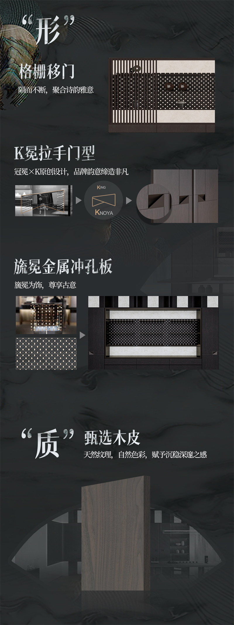 藏玉系列以“形、質(zhì)、氣、韻、神”的五重境界,以小見大、步移景異,串聯(lián)式的節(jié)點打造層次遞進的空間情緒。從歸家禮儀、空間格局以及設(shè)計細節(jié)等多個維度,建構(gòu)禮序雅境。